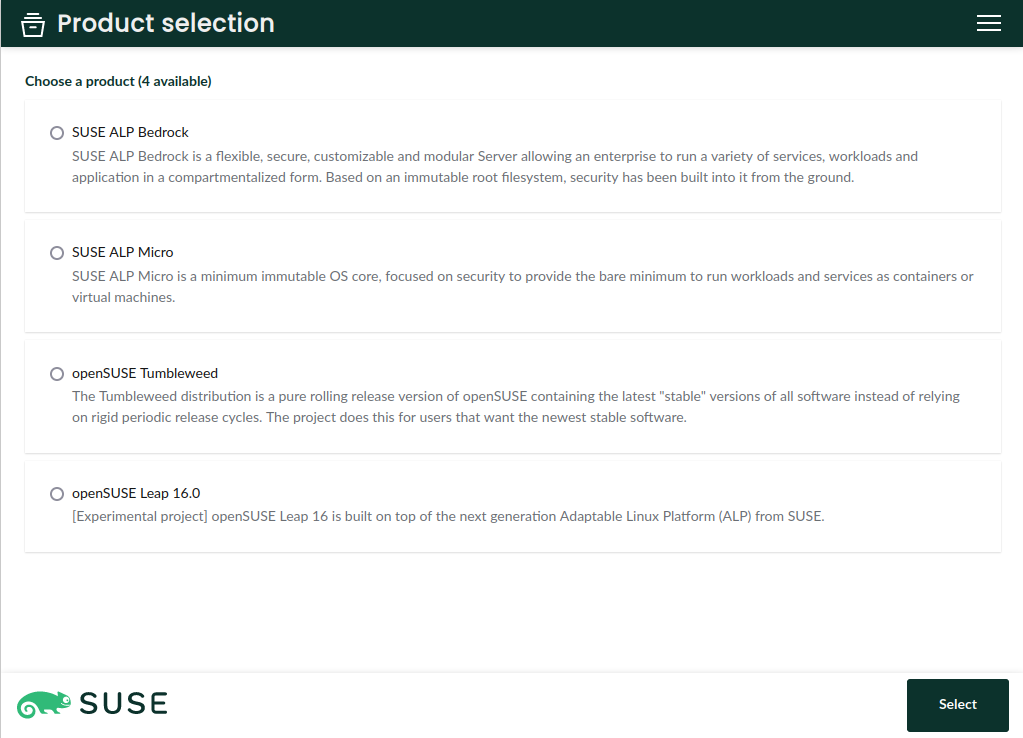 如前所述,我们希望 D-Installer 成为安装一些未来甚至现在的 (open)SUSE 发行版的真正替代方案。因此,第一步是更好地定义受支持的发行版列表,在 D-Installer 术语中称为“产品”。如果您获取我们提供的 测试 ISO 的默认版本,您将看到以下选择。