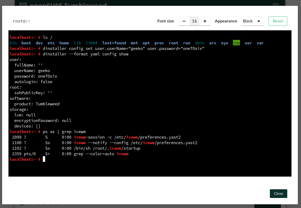 这比看起来更重要。当然,YaST 的支持简化了处理安装到这种特殊平台的细微差别的任务。但真正的挑战是使 D-Installer 本身能够在所有类型的 s390x 系统上运行。我们通常使用略微修改过的实时镜像来执行 D-Installer,其中我们打包了 D-Installer 和 Firefox。关键是,常规的 (open)SUSE 实时镜像默认情况下并不完全支持 s390x。
