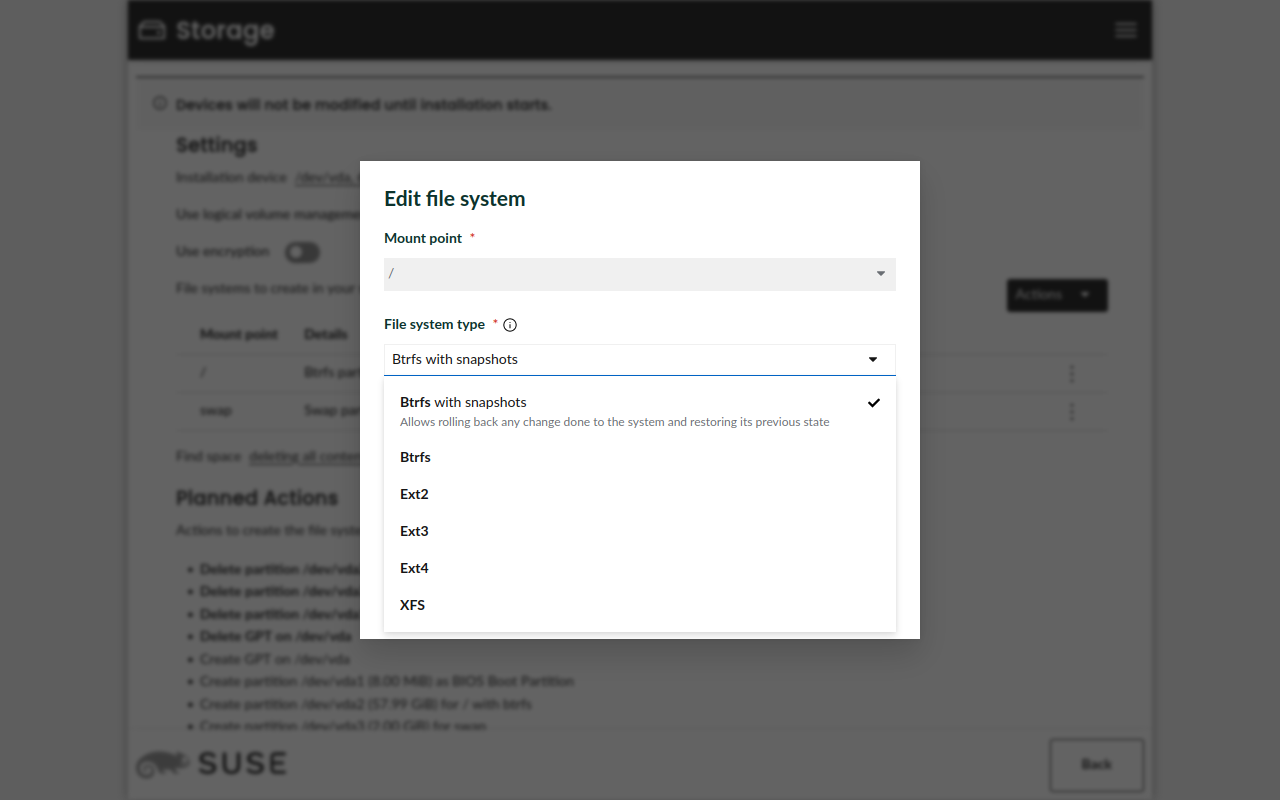 存储区域的另一个重大变化是允许用户为每个挂载点选择文件系统。这包括如果您想使用 Btrfs,则启用或禁用快照。