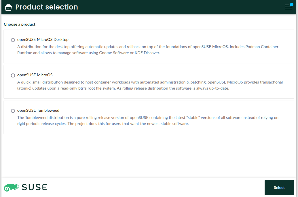 我们还重新组织了 openSUSE 版本的 Agama Live 中包含的 Agama 配置。现在,您可以使用同一个测试镜像来安装 openSUSE Tumbleweed 和 openSUSE MicroOS。