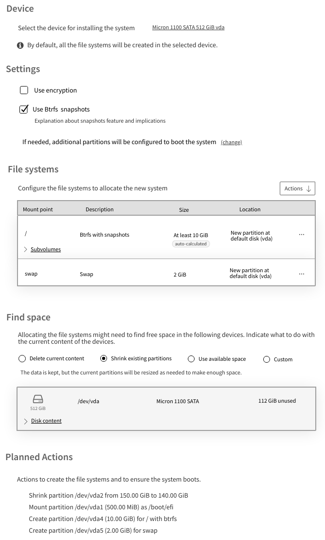 上述架构变更对于远程或无人值守安装以及 Agama 集成到更大的解决方案中非常重要,但对于普通用户来说可能不太明显。这并不意味着接下来的几个月在交互式安装领域将会很无聊。恰恰相反,我们计划对 Agama 的提案页面进行许多改进,该页面允许调整存储配置。